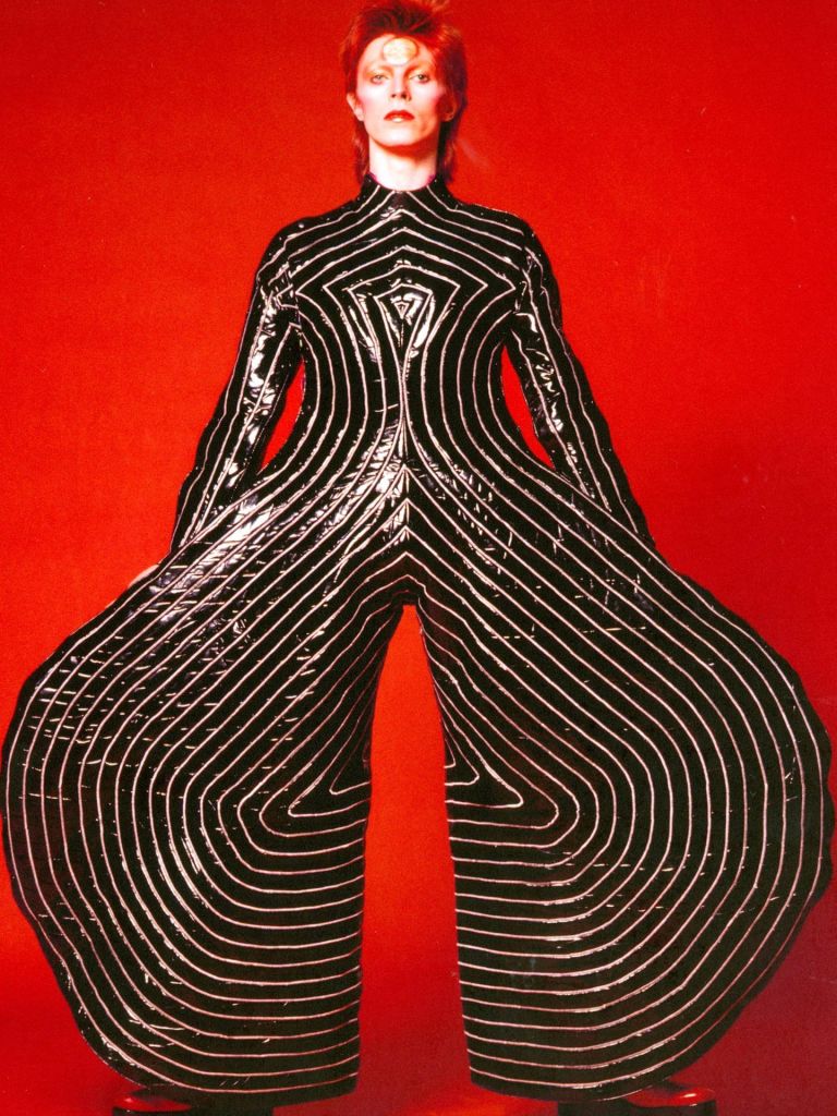 En dos mil veinticuatro cumple ocho años el ritual, no pude permitirme sólo un guiño, decidí lo teatral del período de Aladdin Sane. Es cliché, no obstante, pintarse un rayo en la cara aún me emociona.1 Aproveché que en mi retorno solar tengo el ascendente en acuario para seleccionar el look con el que lo vistió Kansai Yamamoto para el tour de Aladdin Sane.