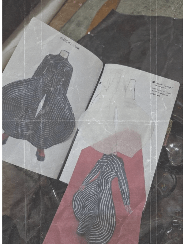Aladdin Sane es un juego de palabras para expresar que alguien está efectivamente loco (A lad insane). Y la locura me alcanza en medio del caos, creo en la práctica de la libertad como un sueño posible. And the bodies on the screen / stopped bleeding. Escojo también desde la historia personal donde me encuentro, Aladdin surge del miedo a quedarse estancado en Ziggy. Lo logra dándole una nueva faceta de su identidad con cada vestuario.